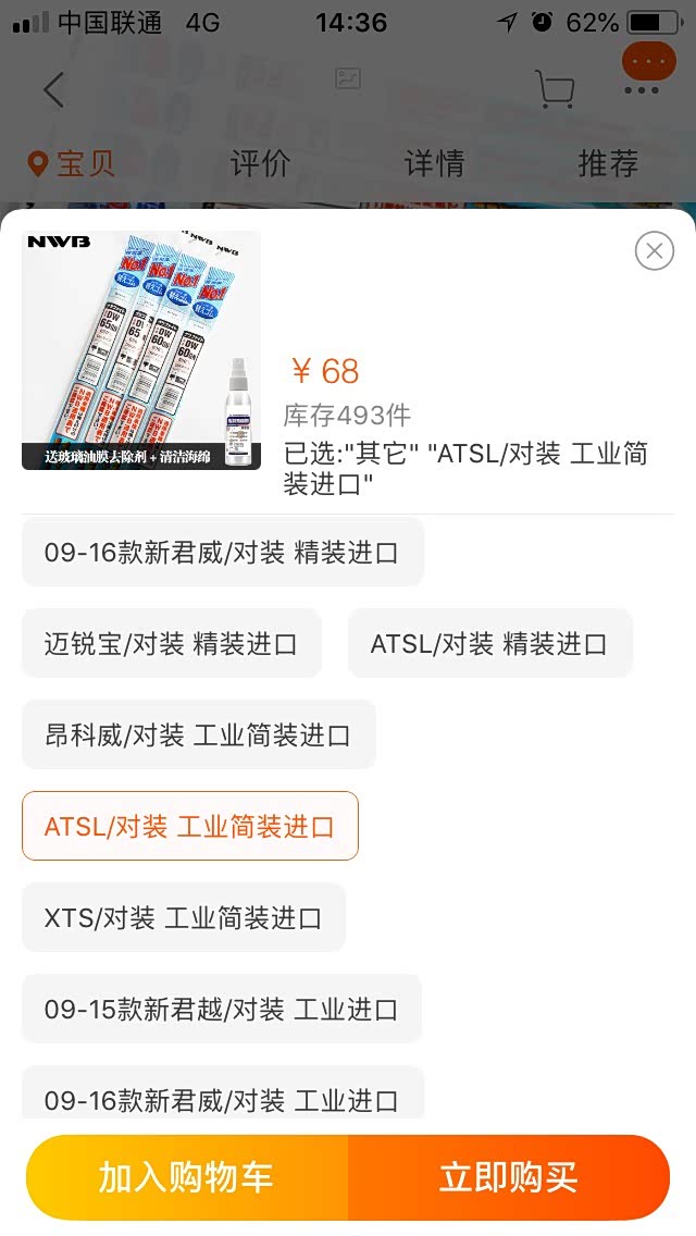 ATSL的雨刮器比较环保,只需更换雨刮条即可,支架可以一直使用。经济实惠。某宝搜了一下NWB雨刮条,随便选了一家,,工业简版包装68块一对