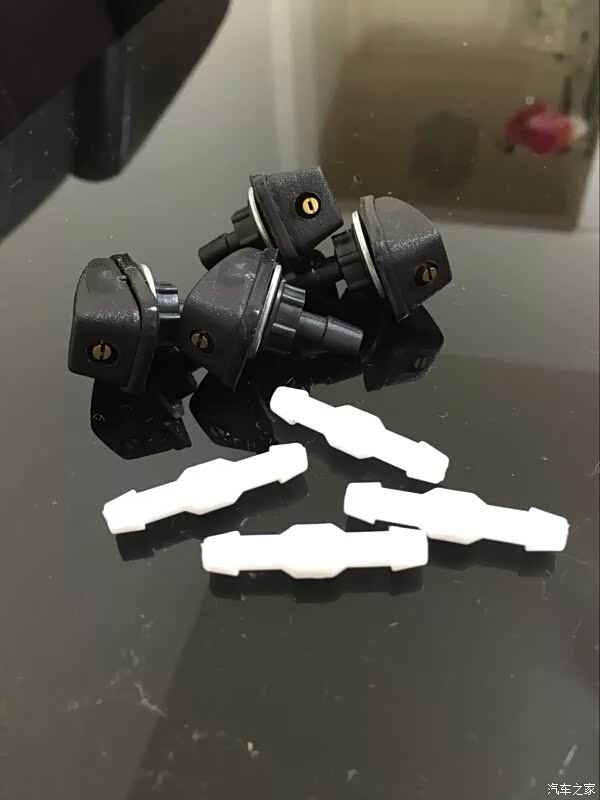 这个很好拆卸卸,拔出连接喷嘴的两根小黑管,拿个小点的手钳,尖嘴钳效果比较好,捏住喷嘴两边的卡子,往出一推,就成功卸下来了,原车的我也不知道扔哪儿了,这会都没找见,也忘记拍照了,不过找不找的到也无所谓,小凯有新的了!