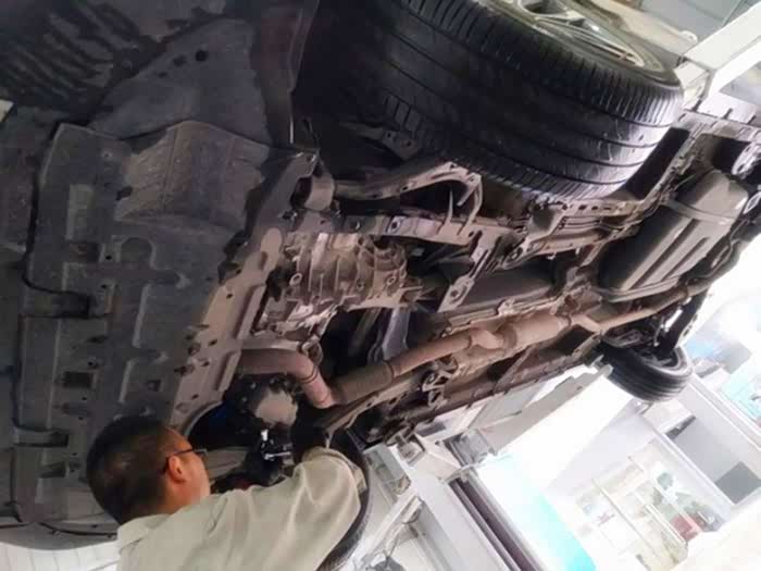 车子的尾部部分沾满了泥,但也不影响师傅检查。