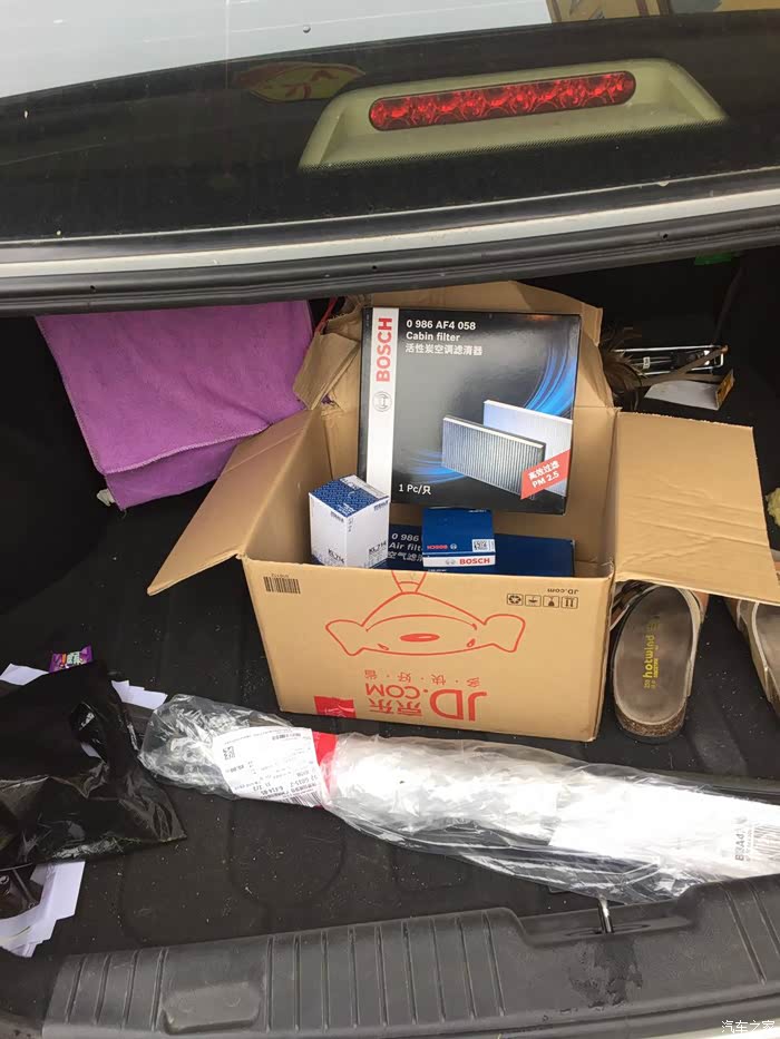 隔了一天,今早才送到。雨刮+空调滤+空气滤+机油滤+汽油滤到货,准备开干。