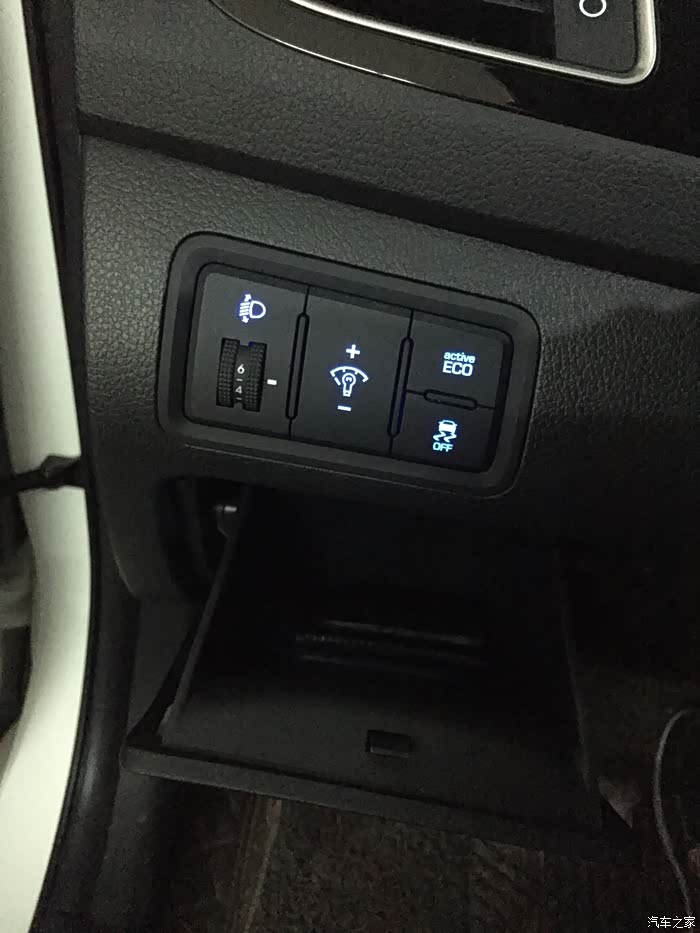 从左到右依次是大灯高度调节,亮度调节,ECO模式以及ESP车身牵引系统的开关,还有个小储物间放放驾驶证和行驶证。