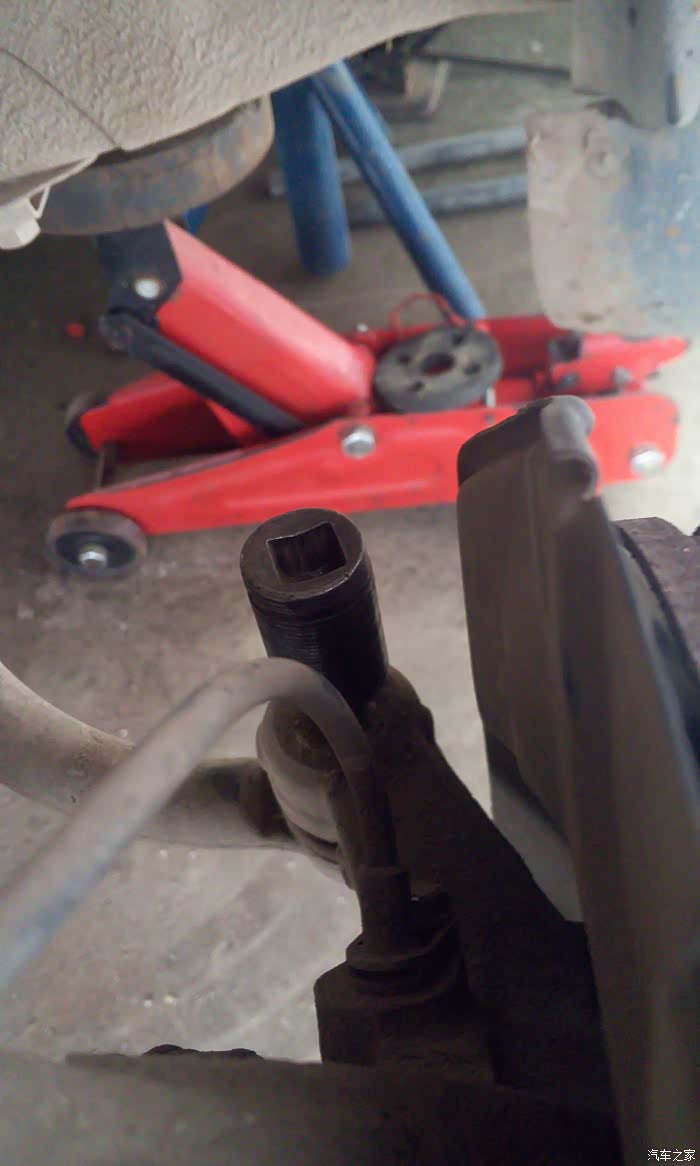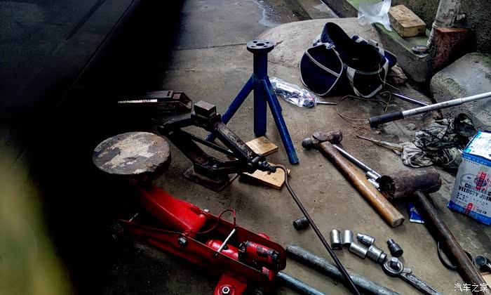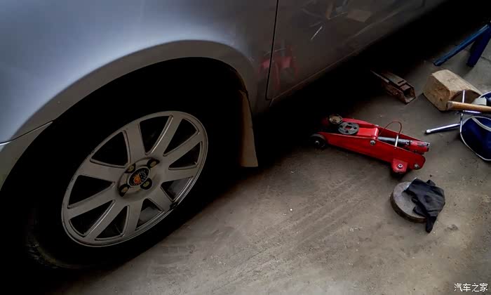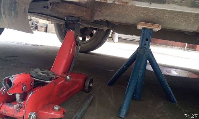 拆下球笼头固定螺帽以后,顶起车来再次拆下轮胎,楼主用两个千斤顶加一个自制的安全支架支撑于纵梁之下