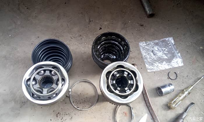 球笼拆下来,传动轴头的卡簧拆下来防尘套拿下来,清理干净