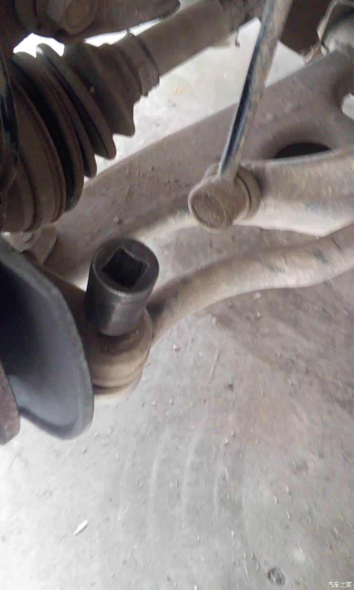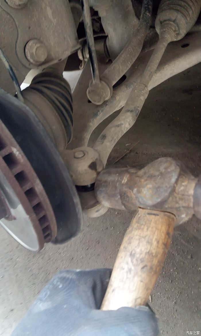 螺丝拆了以后由于手头没有现成的球头起出器,直接榔头伺候,不多两下,方向机拉杆球头就拆下来了(不能敲球头螺丝杆哦)