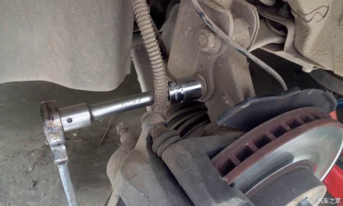 放弃拆下支臂球头,就拆减震器下固定的两颗螺丝,用套筒拆螺母是21mm螺杆另外一头是18mm ,接着拆减震器上的ABS传感器线固定10mm的螺丝