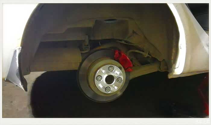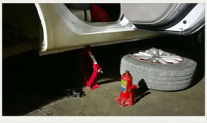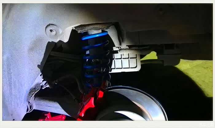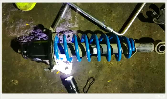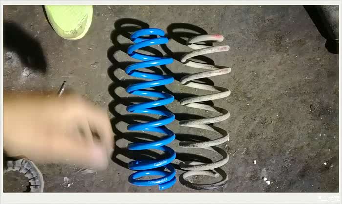 当时觉得差那15mm也不怎么样,不过后来偶尔发生几次后备箱装满东西,后排满载刮底过,不过这也没啥,一直用到最近,因为加了法兰盘,轮毂出来了点,这样满载就更危险了。于是我决定更换恢复原高的天之蓝弹簧,马云家购入后恰逢情人节到货,于是马上下班后借用朋友修理厂场地和工具,开始安装!