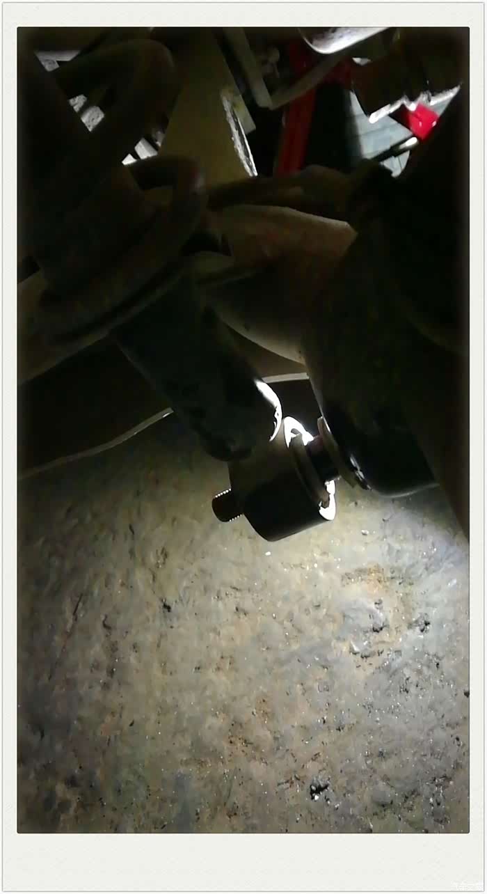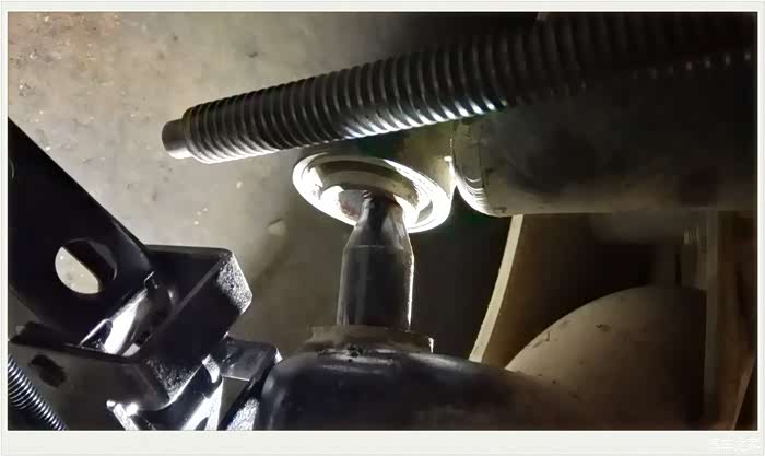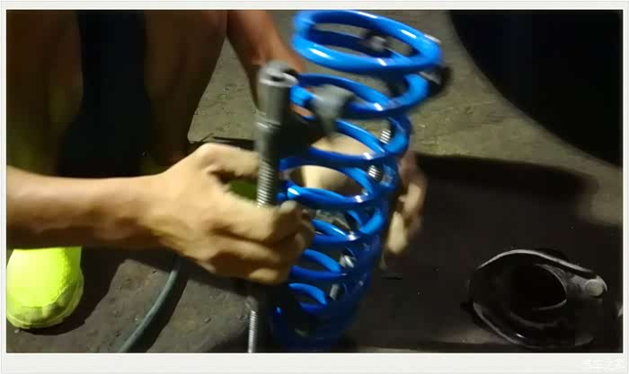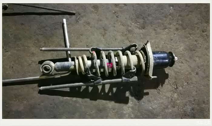 搞定!结构是塔顶锁紧螺丝----上托盘-----缓冲胶垫----弹簧-----下托盘。安装时候底下托盘弹簧和上托盘缓冲胶垫一定要到位,然后装好松拉马前最好是去车底下对下安装位是否正确,否则安装孔不对,又要压弹簧调整孔位,我第一个减震就折腾了2次,手工拉马压弹簧好累的,哈哈!