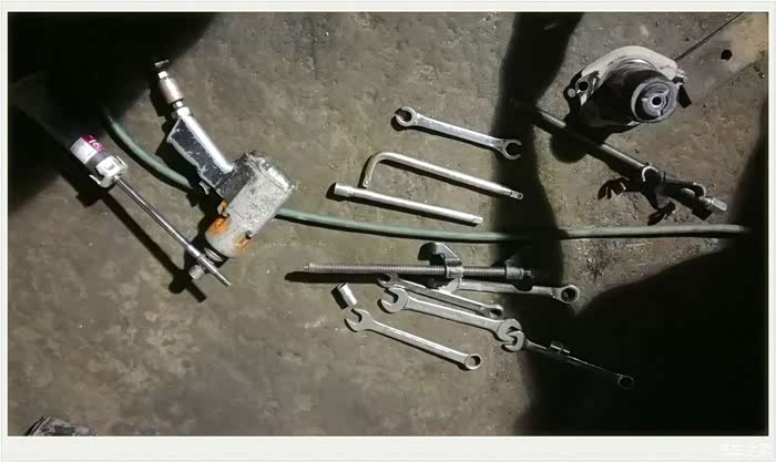 减震顶部螺帽规格19mm,风炮对付。打松后,用内六角插到螺丝顶部,用17梅花配合即可拆除。这样弹簧就可以拿下来了。