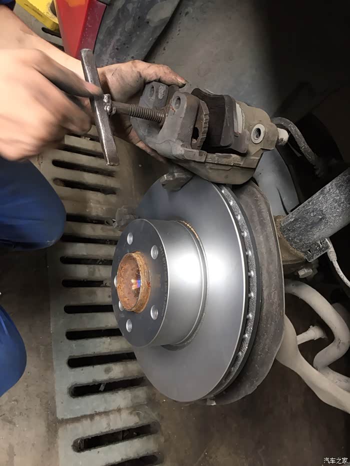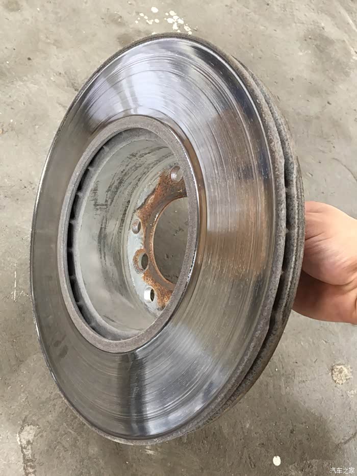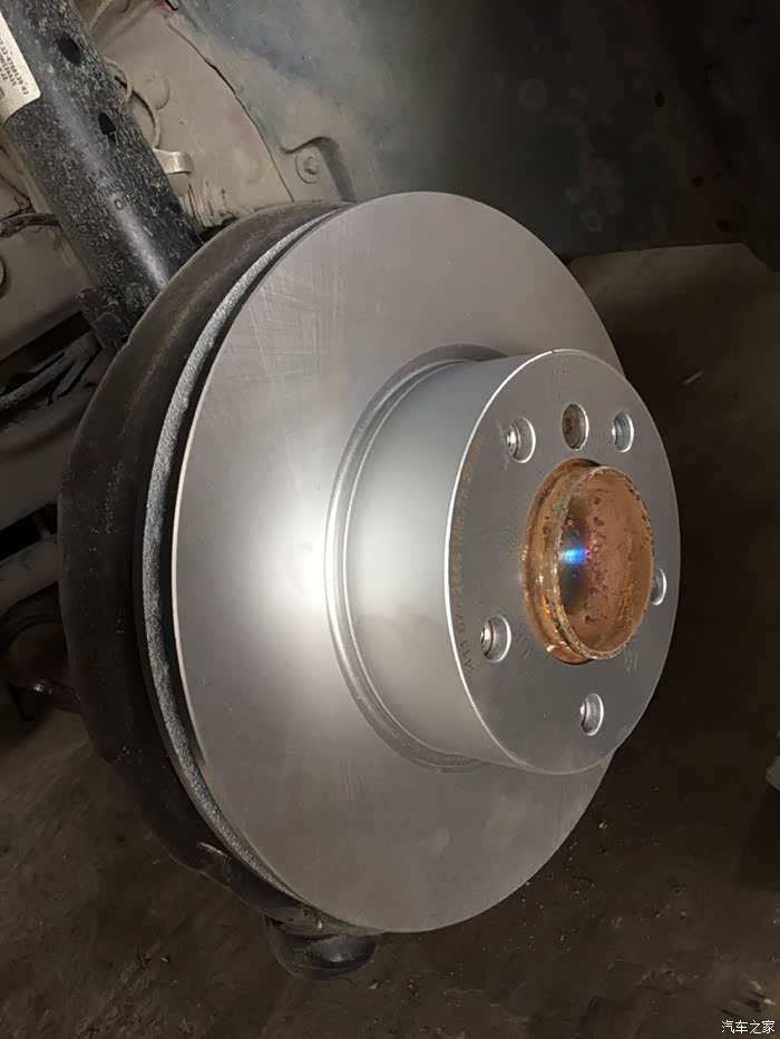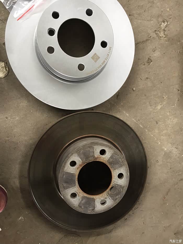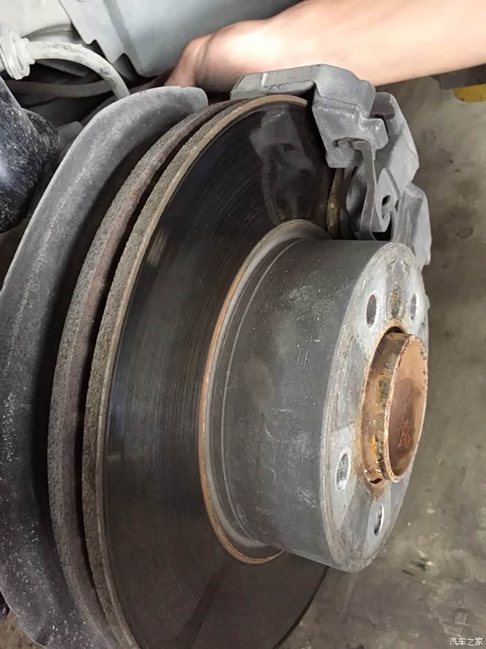 更换前刹车盘原因,之前车主换的刹车片质量“太好”过硬,开了一年4万2千多公里,硬是没少刹车片,不幸的是把刹车盘磨的凹凸不平,导致刹车时失去该有的性能,踩刹车很硬不线性!也拖了一段时间,上次换避震时就想换了,由于工作忙所以拖了段时间!刹车油也没有检查车子跑了快11万公里就顺道换了,火花塞距离上次一年跑了4万出头也改换了,下面上图,手机拍比较凌乱!