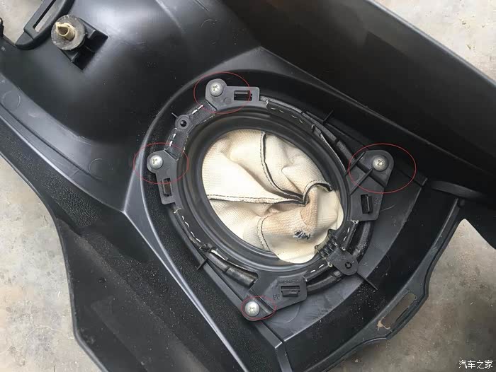 中央扶手取下来后反过来,我们可以看到防尘套就固定在上面,四条螺丝,十字改锥取下