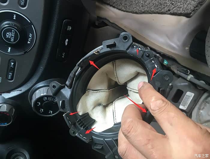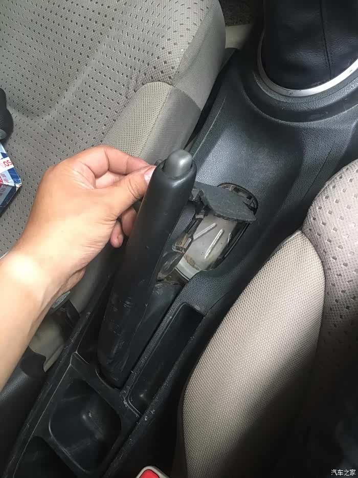 拉起手刹,下面有个盖板能扣开,直接网上扣就能,卡扣卡着呢,不扣这个手刹正好挡着下面,取不下来