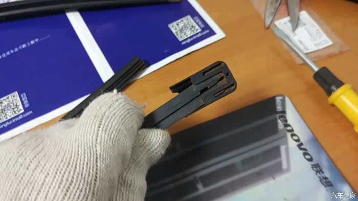 换第二个雨刮胶条的时候,下卡子没那么顺利了,按的手疼,果断戴“套”。