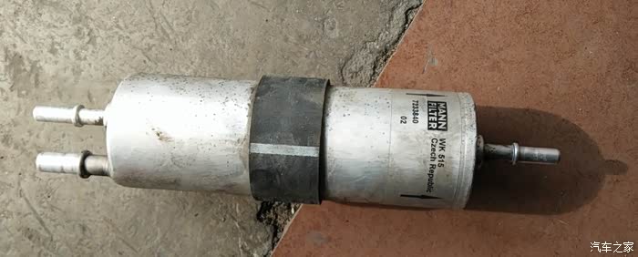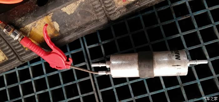 拆下的旧汽油滤,里面大约还有个三百毫升左右的汽油,倒出来存在小玻璃瓶里可作它用。