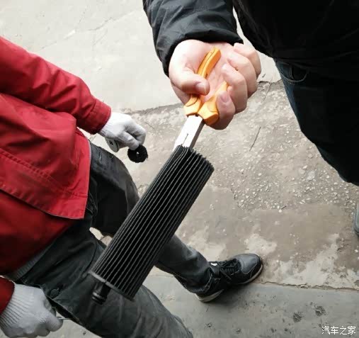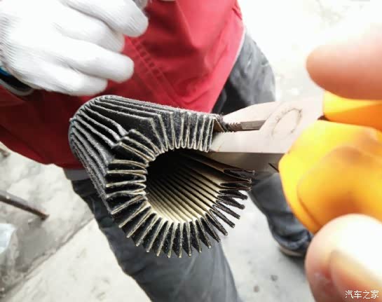 担心汽油带来的安全隐患,我还在纠结是不是要将它静置一两天后再作解剖,但已经有人迫不及待用切割机切开了铝合金外壳,抽出了滤芯。