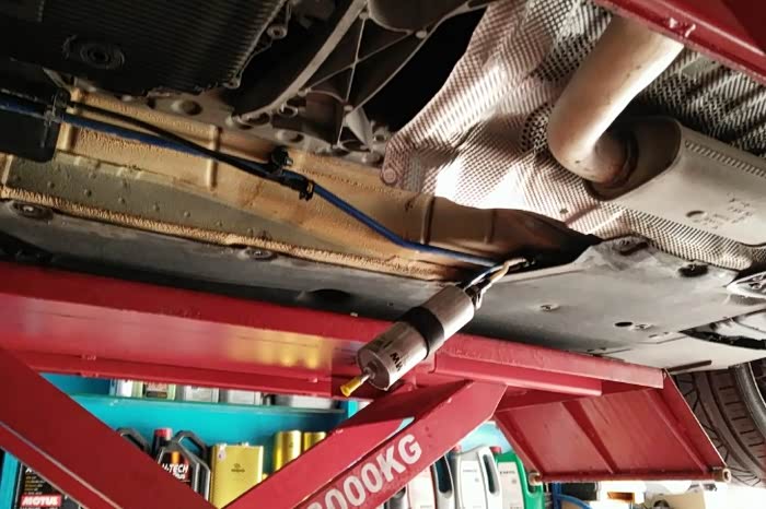 没有四点式提升机,用这种就是有点麻烦,每次都要瞄准位置,而且后驱车上架子的时候容易,退出来的时候容易打滑。大部分汽车的汽油滤都在车辆的左侧,而1系的在车底右侧。进退了几次借车身位才搞定,可以看到左侧的举升台已经被我压歪了。。。