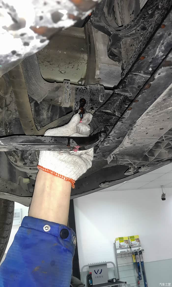 等防冻液不再流之后,再次举升车辆,把水堵拧紧,并清理干净。装上底护板
