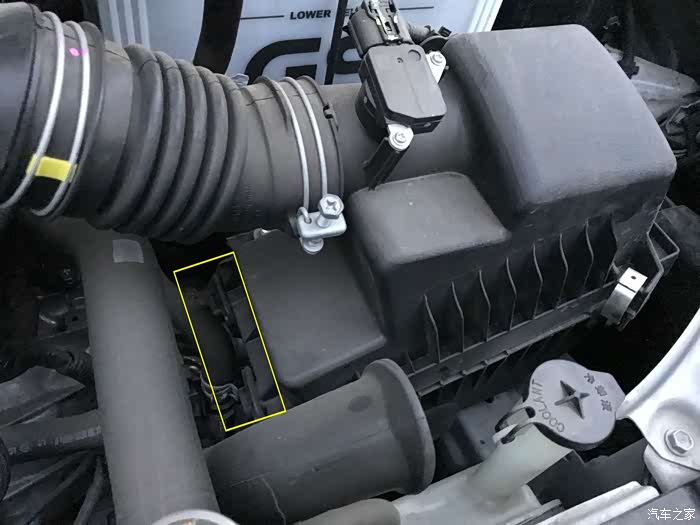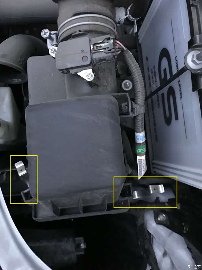之后先将空气格盖子的一层,两个卡槽对住,如图黄宽标示的位置,