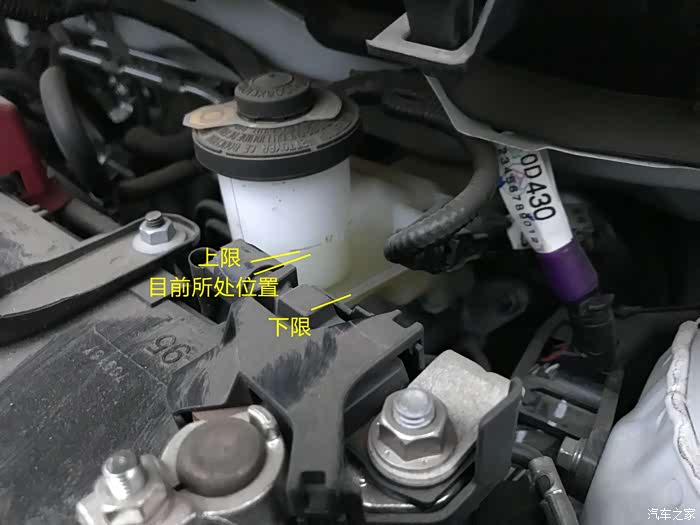 这里是制动液也叫,刹车油,这里一般不会有缺少,检查下正常位置便可,如同所示处于上限和下限位置便是正常