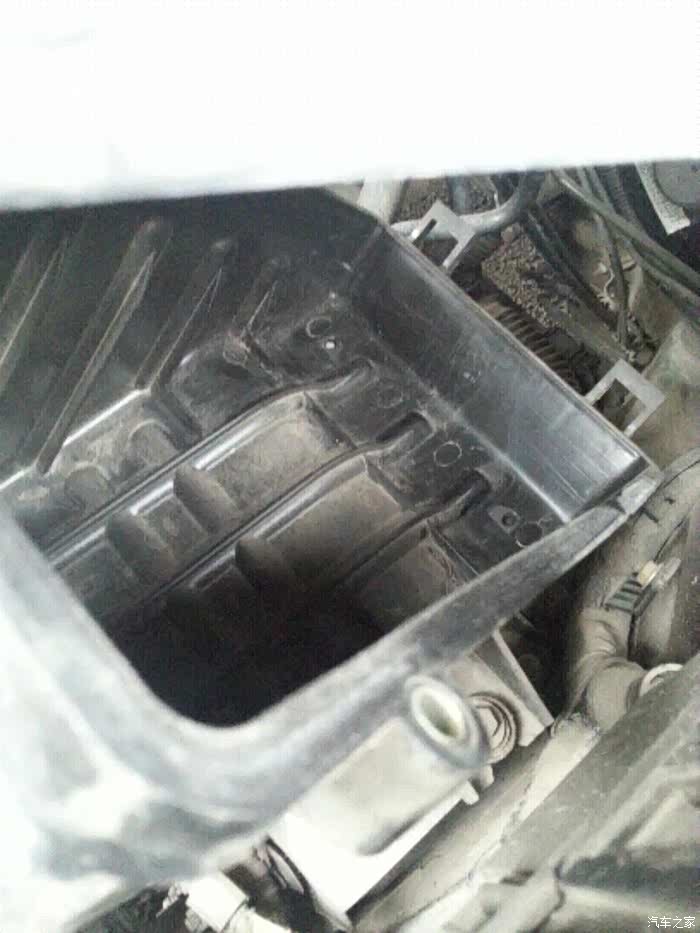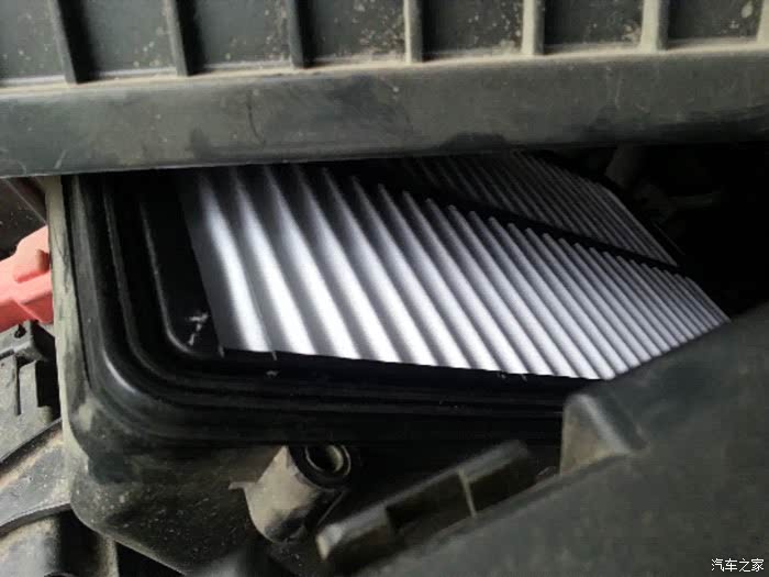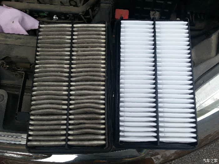 轻轻摇一摇,打开盖子,有一定缝隙可以拿出滤芯就行。这是空滤发动机进气侧对比,老空滤虽然黑,但还算洁净,过滤效果可以