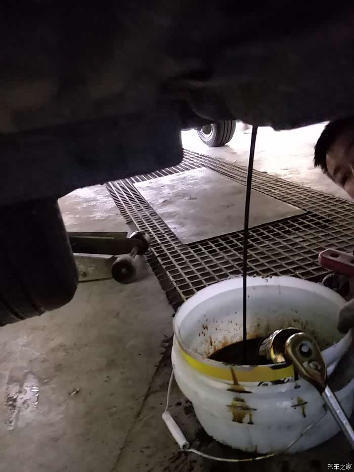 架起来以后旧开始放油了,唉,也是跑了很久了,油的颜色都有些发黑色,应该及时换机油,这样车的性能才能发挥到最佳状态。师傅干活很辛苦,直接就躺在地下了,手动点赞~