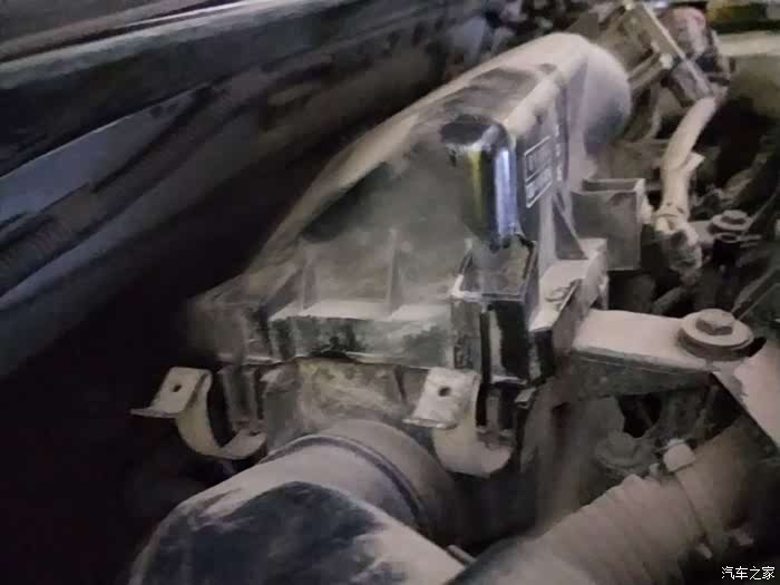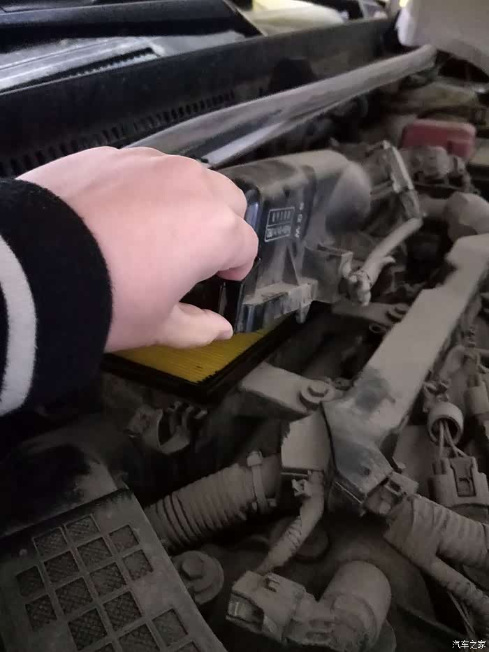 这是准备换空气滤了,机盖里边还挺脏的,都是灰尘,就是个卡扣连接的,很容易操作。