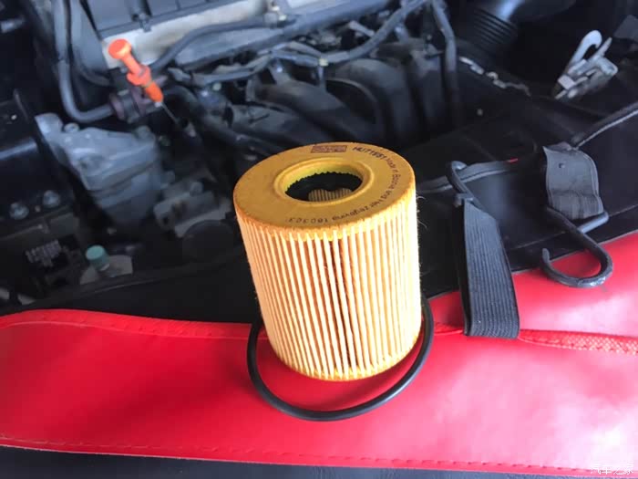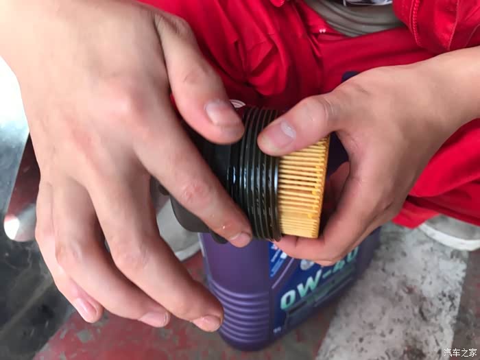 技师在安装全新滤芯的时候仔细的给机滤密封圈涂抹机油小细节做的很到位