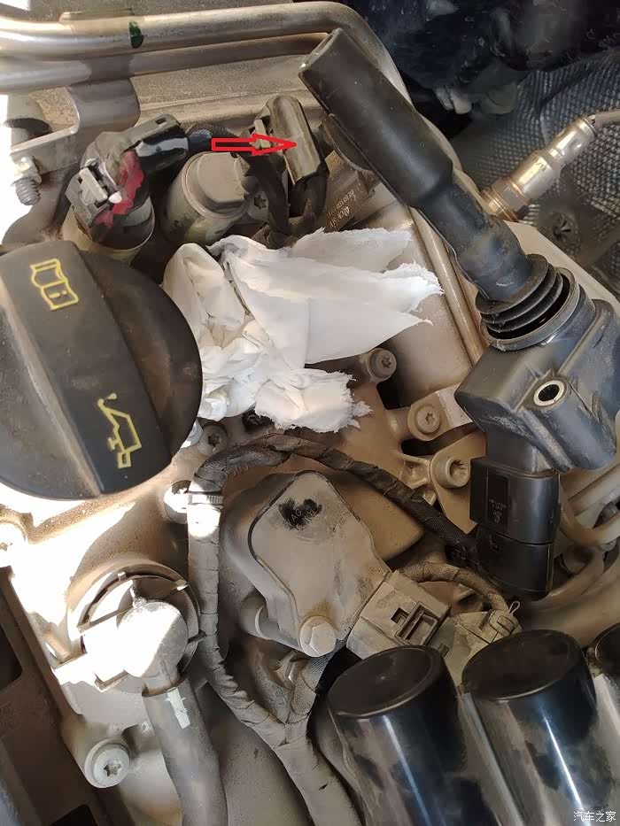 拆下固定螺丝,先轻轻转动一下点火线圈,再往上拔出来,箭头指的是点火线圈,建议换完一个火花塞,在拆下一个,