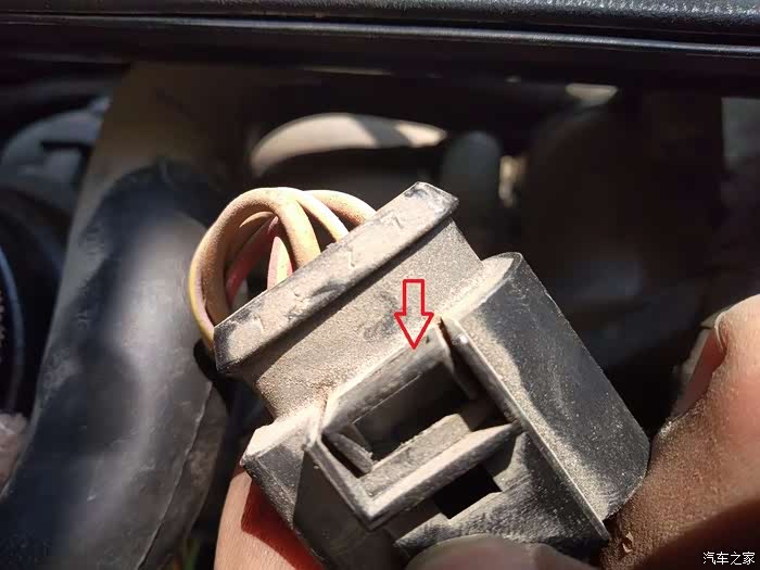 这就说4缸了 ,4缸需要拔掉这个点火线圈的插头才可以,用个小平头起子往下压箭头处,就可以把插头拔出来,然后就同前三个一样拆掉点火线圈就可以了,拆火花塞,就不上图了,用火花塞把手逆时针就卸下来了,不过,原车火花塞比较紧,需要用点力!