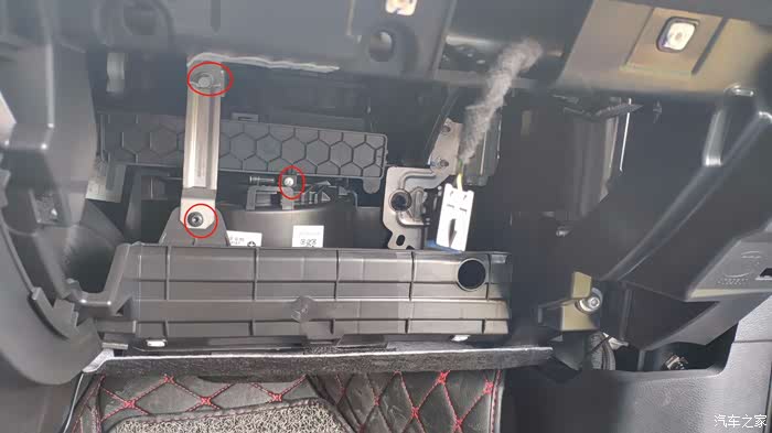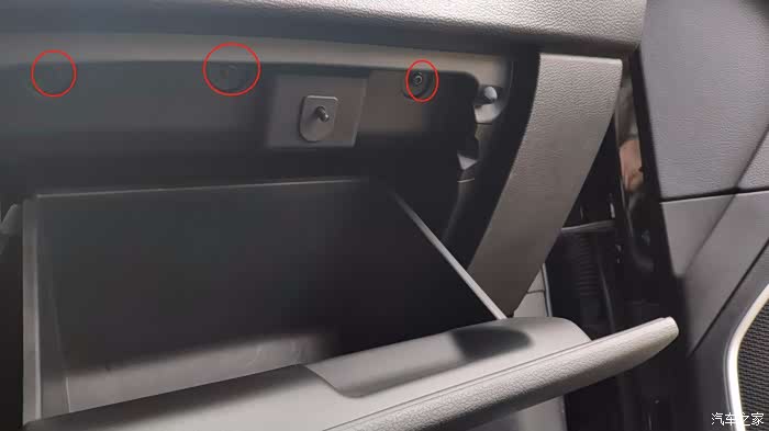 拆除上面6个螺丝.整个手套箱就可以取下来了.手套箱剩下是卡扣的,不会自己掉,需要自己用力往外拉一下.一定保证这六个螺丝都取下来再拉!.不要完全拉出来,里面还有一个接手套箱灯的线,需要把这个线拔下来.