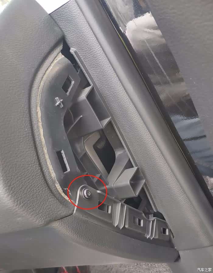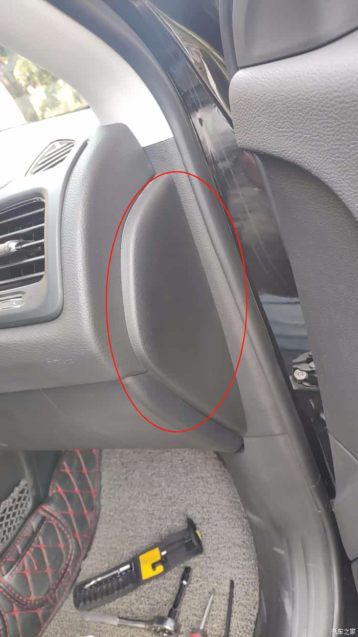 打开副驾驶门,用塑料撬棒撬开.用手掰开也行,里面是卡扣.垂直用力不会坏的.行车记录仪走线也可以走这里.