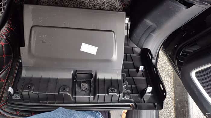 合上手套箱,找到手套箱的下面,在这个不知道什么材质的里面有两个T25螺丝,左右各一个.用手稍微掰着,拆掉.这个地方一个人不好拍照.