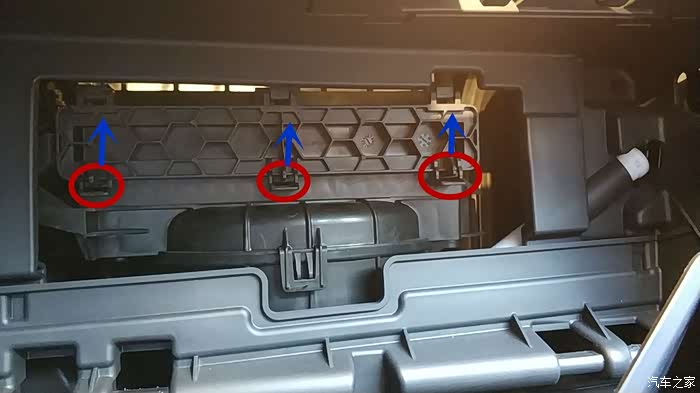 储物箱拆卸完成后,开始拆卸空调滤芯密封盖,上图带六边形花边的便是密封盖了,将图示红色圈内三个锁扣按箭头所示方向用力扳动,即可轻松取下密封盖。