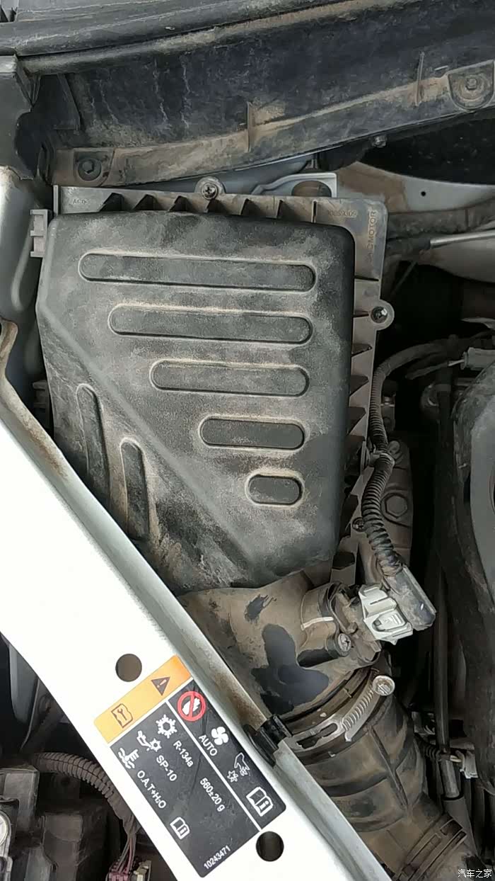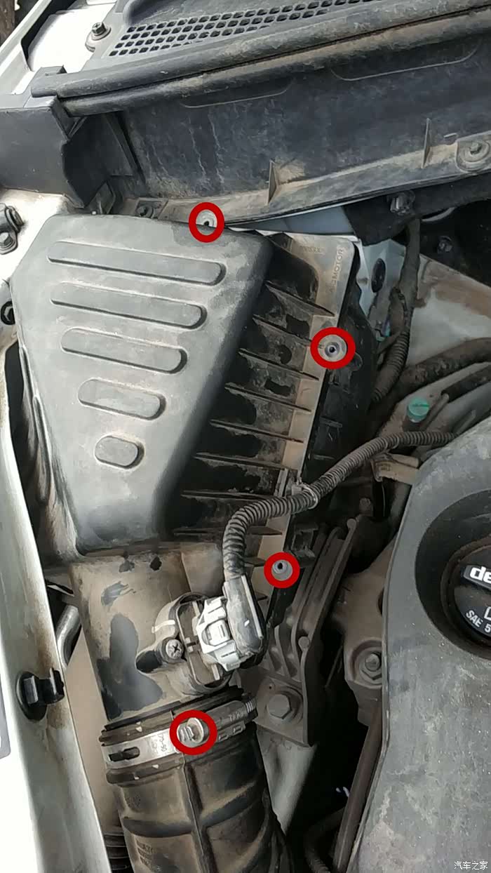 打开引擎盖,在发动机舱的左上角有一个空气滤芯盒,如上图所示。图示红色圈内是拆卸空气滤芯盖必须卸下的螺丝,其中有一颗螺丝位置被遮盖,不过不难找,稍微找一下即可发现。