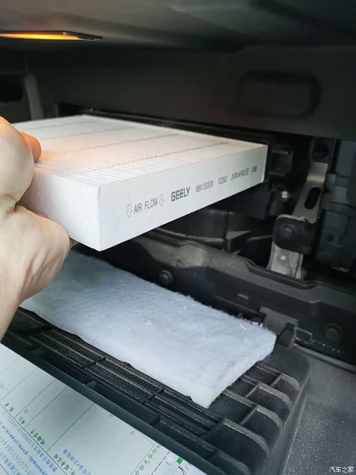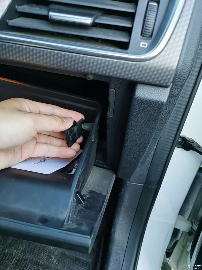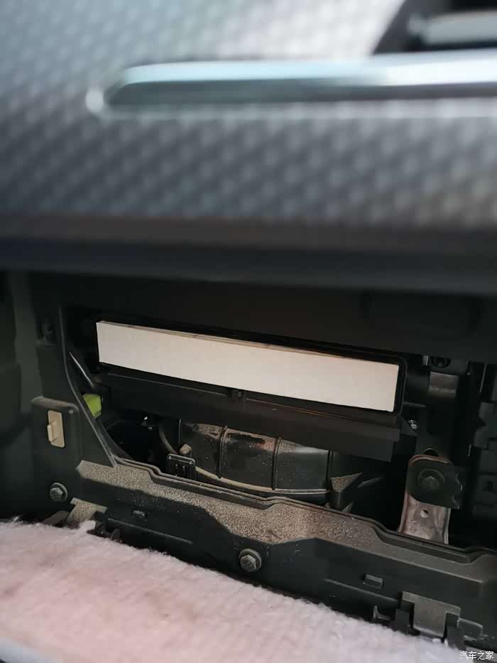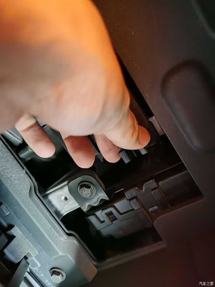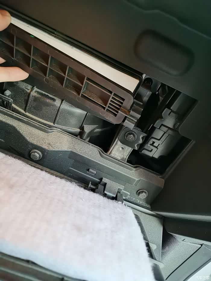 首先就是拆手套箱,把上部两边的卡扣位置按住,往外推即可,然后是拆卸手套箱的连接杆,此时便可以完整看到空调滤芯的位置。然后捏住取下盖板后,看到放置空调滤芯的地方,直接将滤芯拉出即可,更换完成,再按拆卸倒序逐步安装就大功告成了。