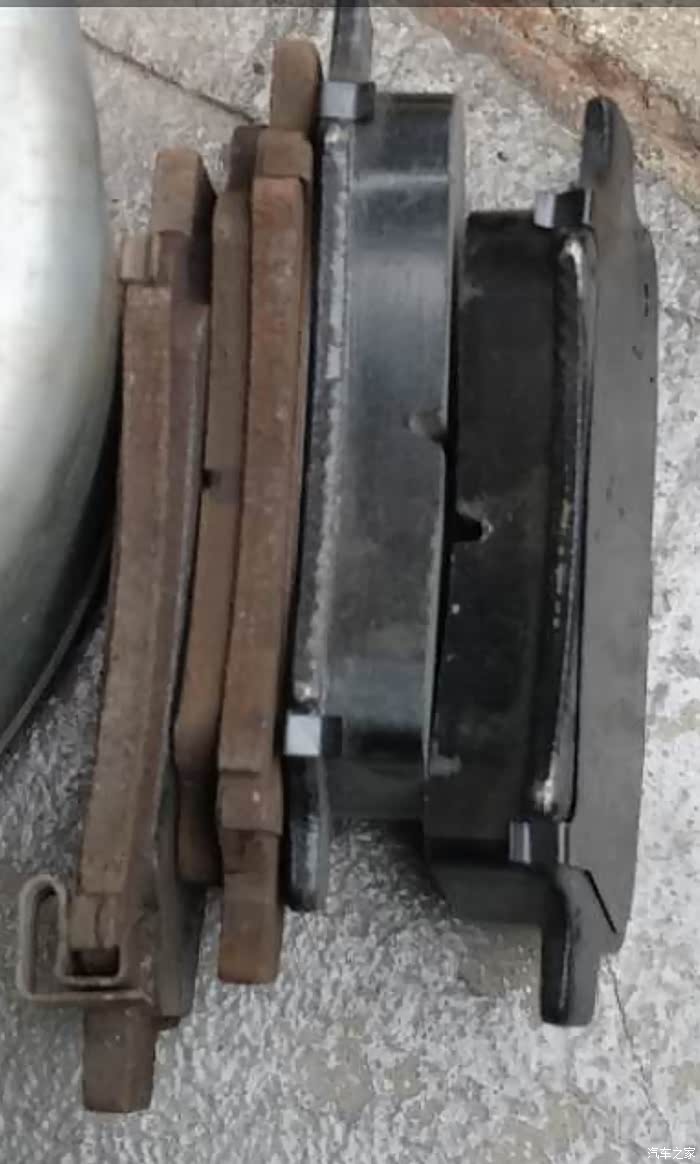 新旧对比,刹车片上有一小片薄铁皮和极限磨损报警片。其实报警片就是刹车片薄了后磨刹车盘,产生异响。