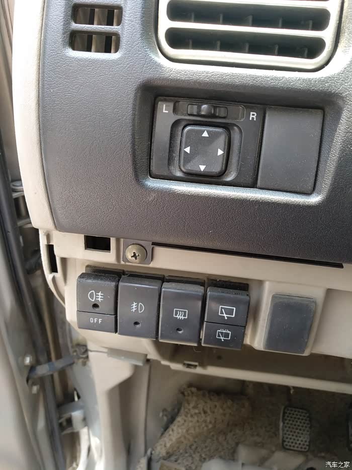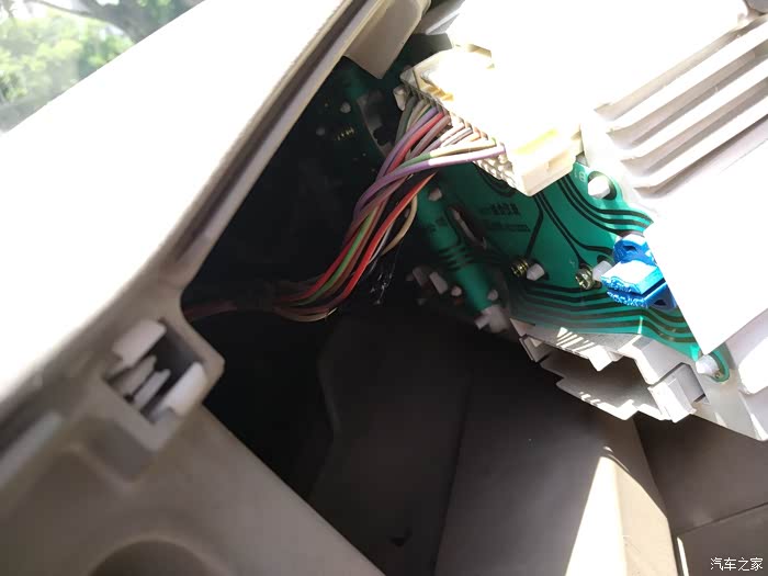 这里上面2个螺丝,这时候可以拉出仪表盘外面罩子了。注意左侧里面有后视镜调节开关的线束,拔下来插头。