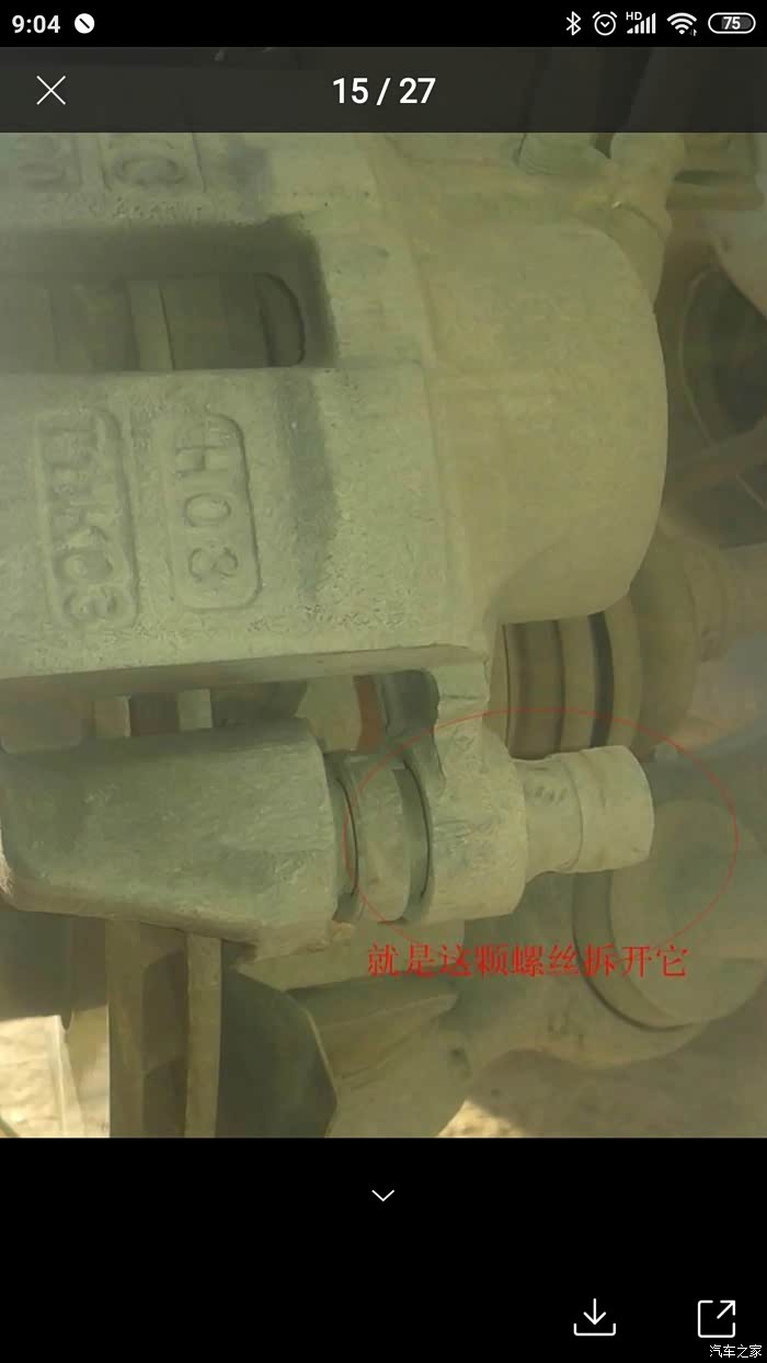 借用论坛朋友图片,拆这个分泵螺丝,然后方便往上翻就行。刹车片留在下面刹车盘上。更换时一定要注意防护,后轮胎垫上,防止滚动。千斤顶顶起,用大木块垫上,防止车子晃动和滚动。
