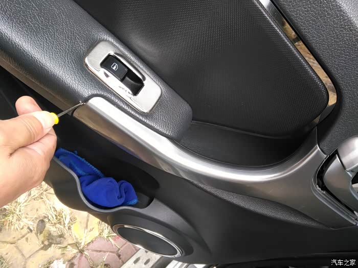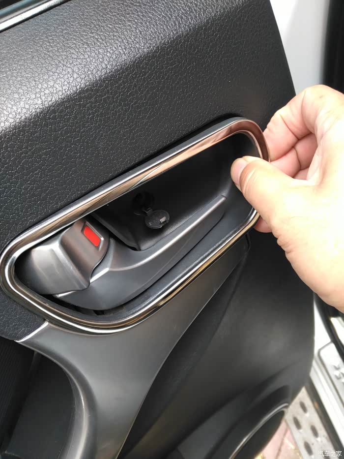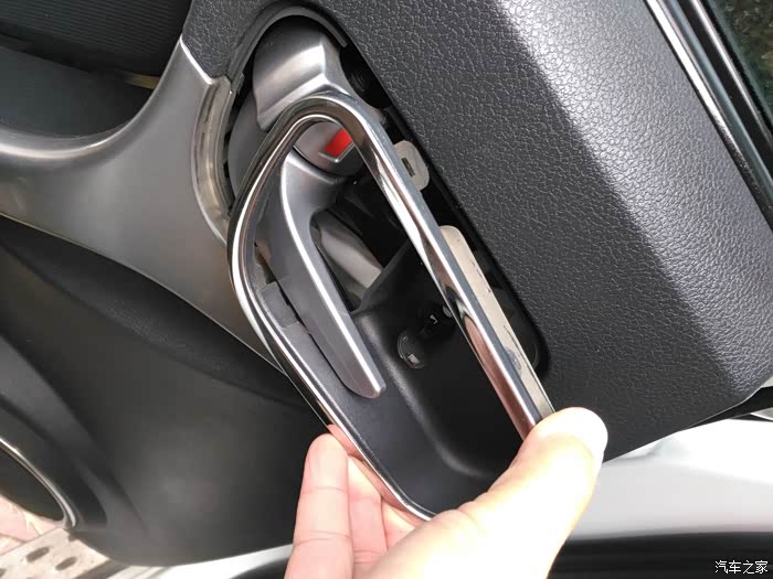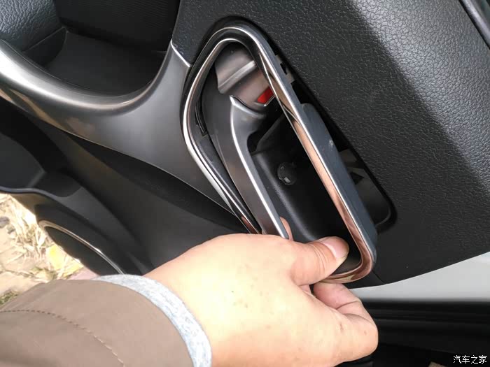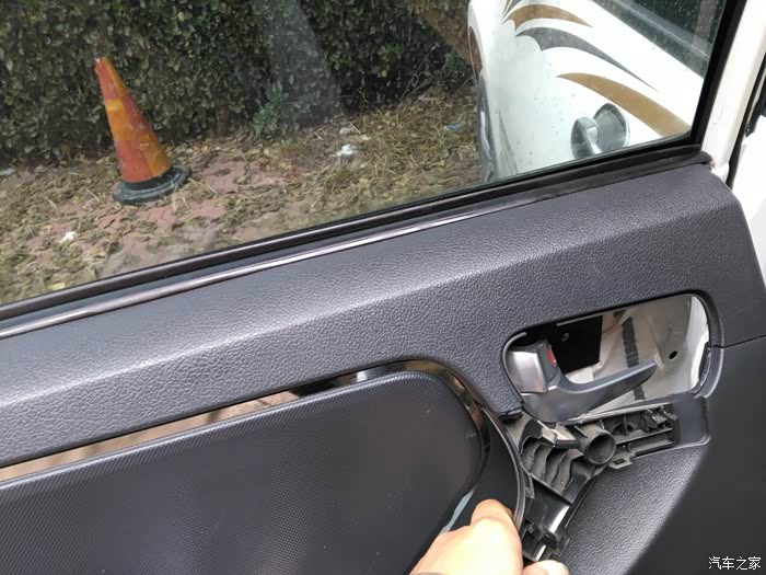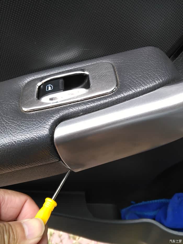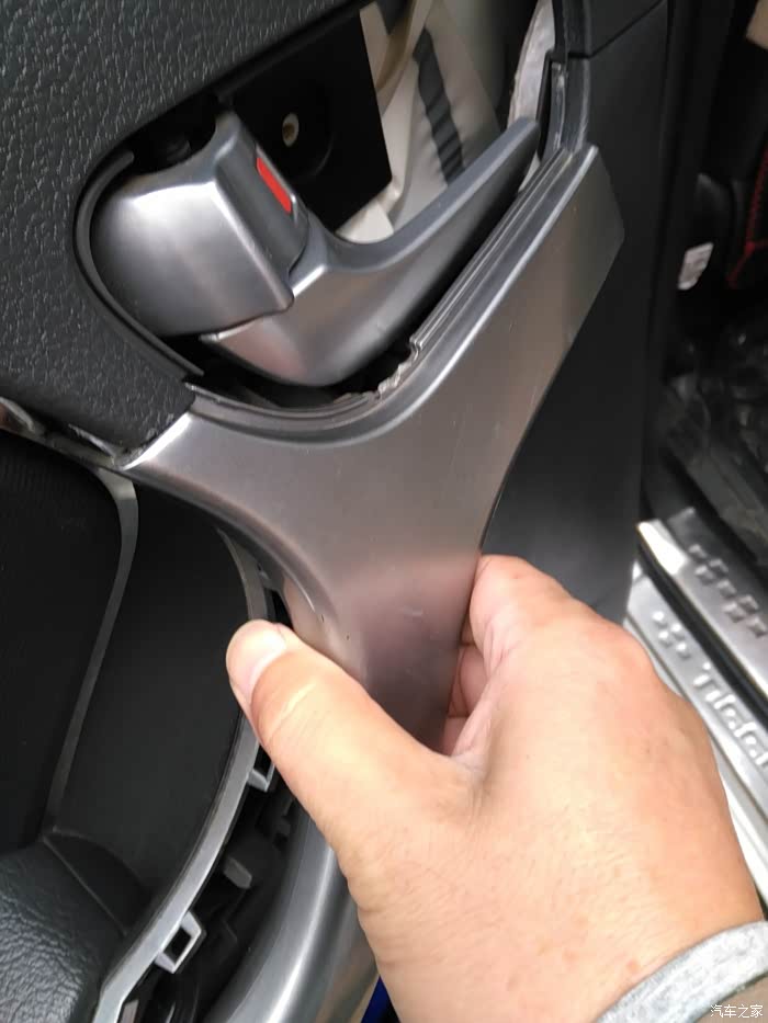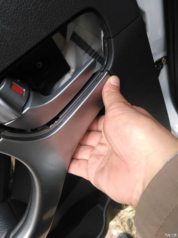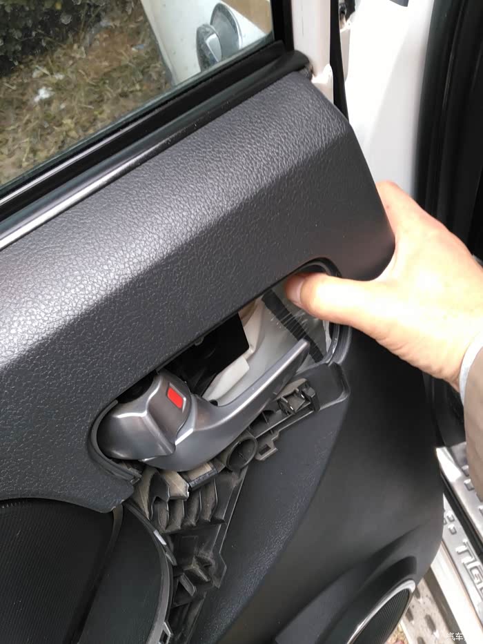 拿下拉手盖板。盖板上面有三个塑料卡扣,现在的天气还可以,不是太冷,不必担心会弄断卡扣。