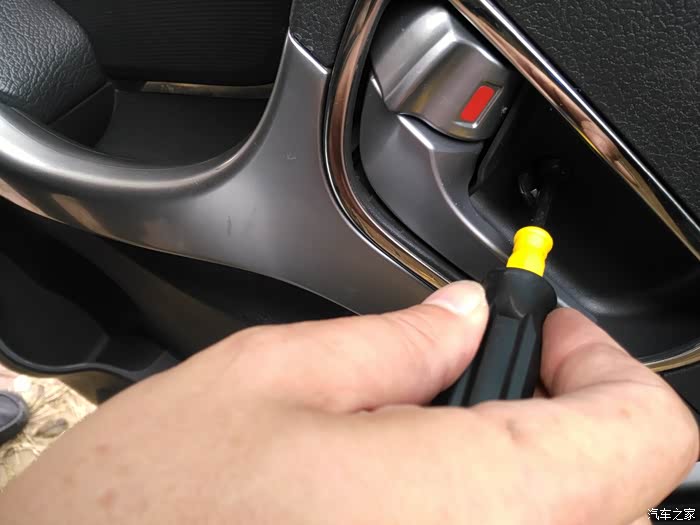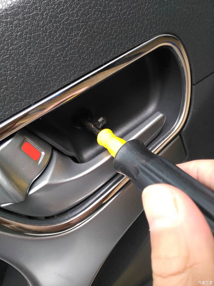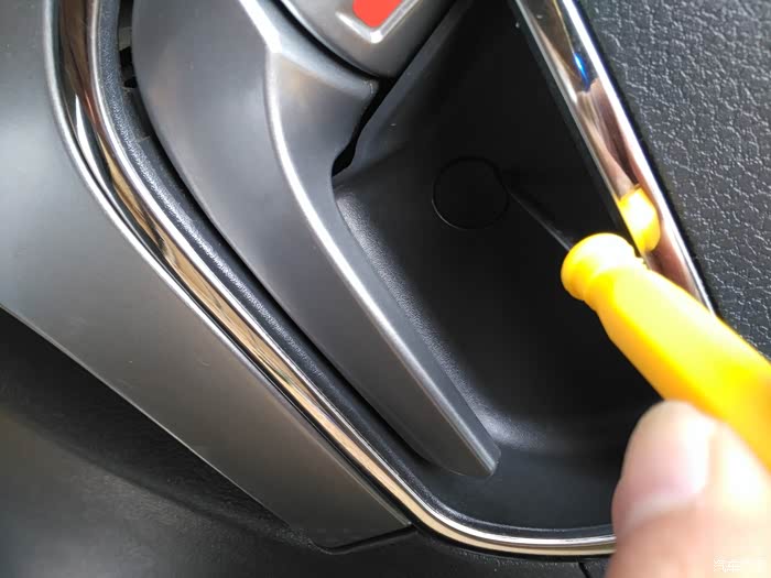 接下来拆门板。这个位置有卡扣,用一字螺丝刀插进去撬开卡扣
