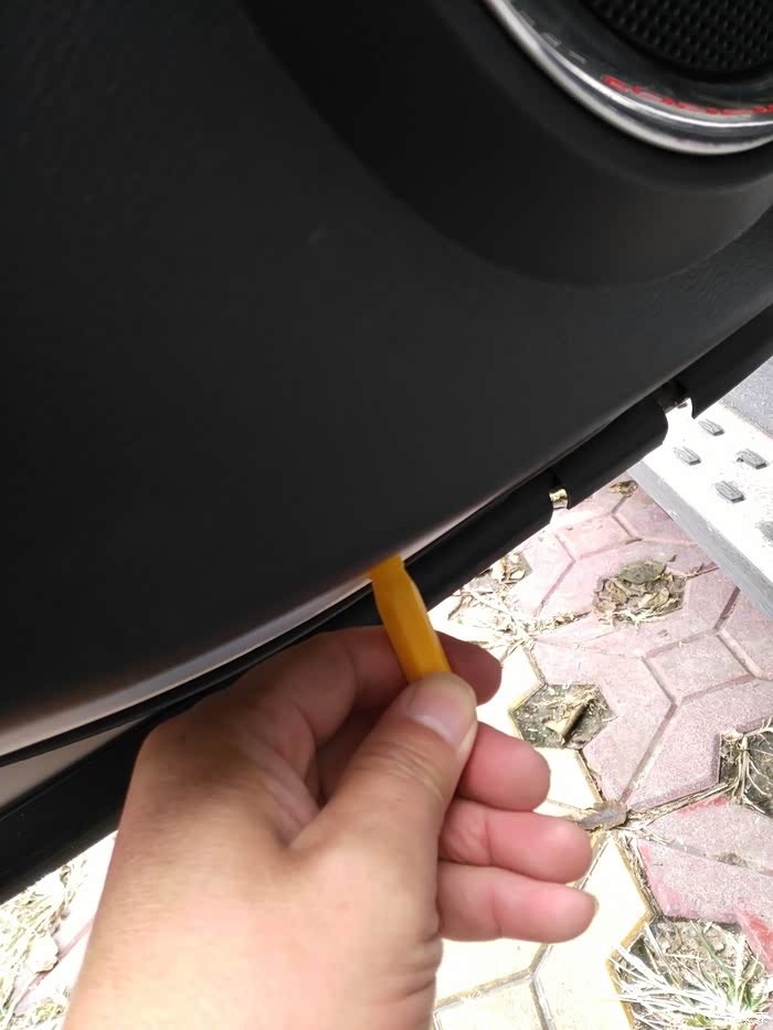 接下来拆下这块装饰板。这个位置有个卡扣,先用一字螺丝刀在这里插进去,往上撬,撬开卡扣