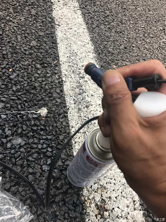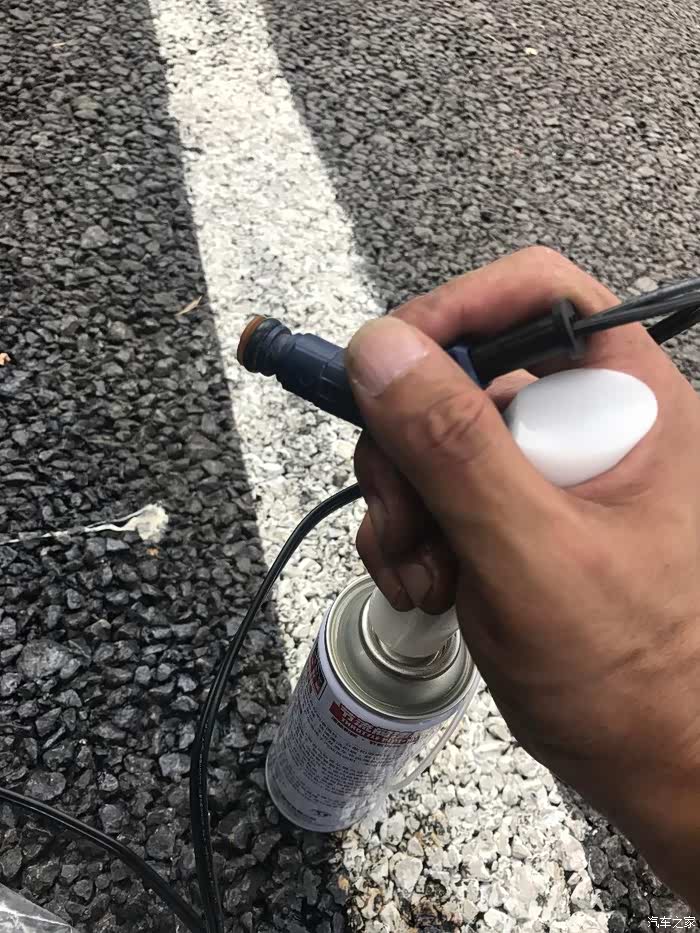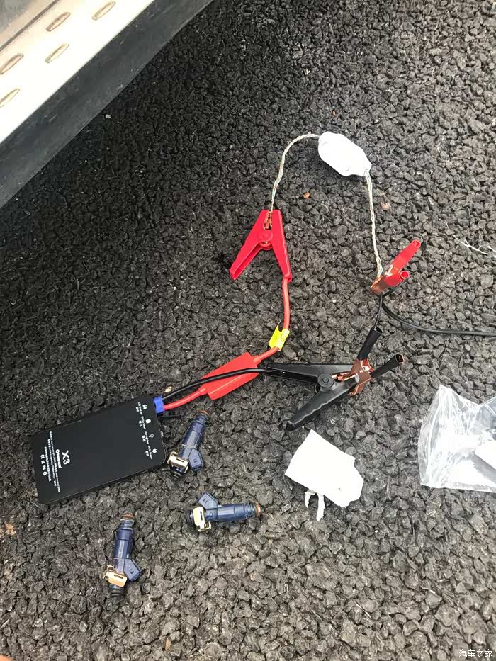 连接好应急电源,开关。把电源线插在喷油嘴上。