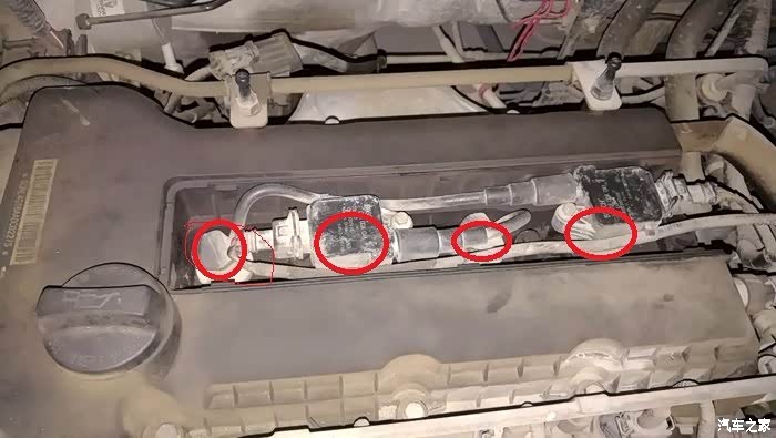 首先掀开机盖,拔掉发动机保护罩,可以看到这个,画红圈的就是四个火花塞。