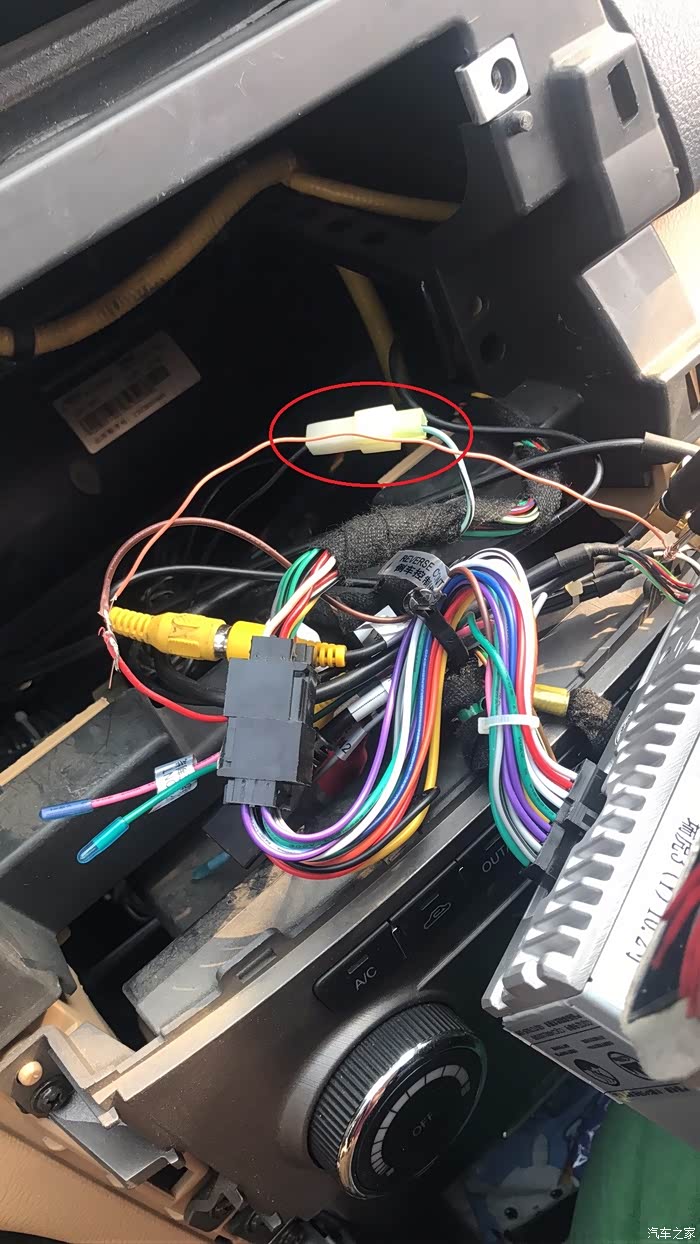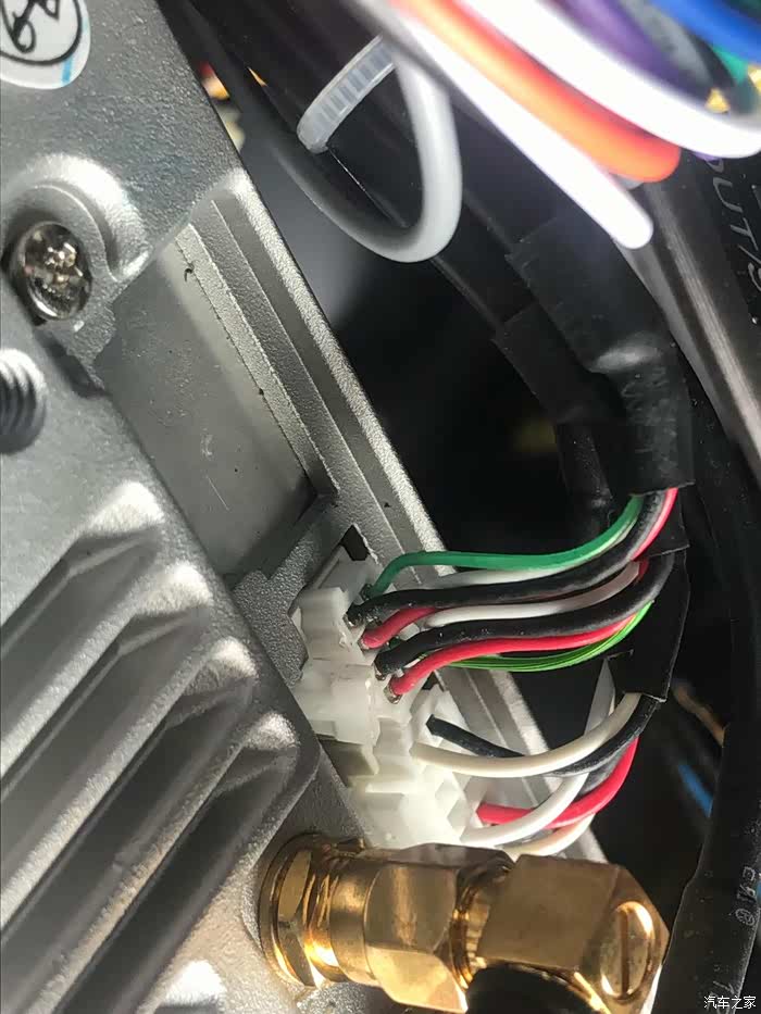 红圈部分是收音机信号放大器的电源线。有网友说是5V的电源,经检测,由于电源线虚插,导致没有给放大器供电,用力插进去,万用表测得电源为10V,很奇怪,怎么是10V的?车上不是只有5V和12V的电源吗