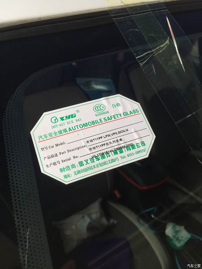 倒霉啊,被路上飞出来的石子砸了当时车速60码,由于新手后来忽视了没仔细查看前挡玻璃,造成缝隙裂纹越来越大无法修复,只能更换前档玻璃了。问了4S店报价850包含人工,觉得太贵了。听了老司机的建议去外面汽车玻璃专卖店换,在网上查了一下虎子的前档玻璃的牌子,问了一下汽车玻璃专卖店,果断问了一下价格是350元,牌子是信仪的是奇瑞的配套玻璃。为了安全行车周末果断去换了。