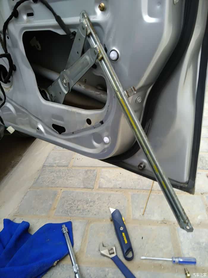 装回去,这个过程没有人帮助,真心不好弄,要是有个帮手,可以提着玻璃,很轻松就搞定,把升降器组织的滚轮卡时玻璃下方的卡槽里,固定好4个螺丝。