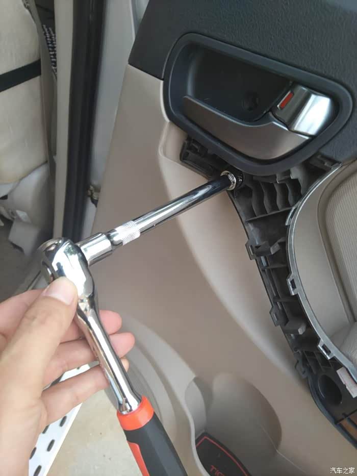 取掉之后门把手的地方的颗螺丝,用梅花取;内扶手有两颗螺丝,用套筒取