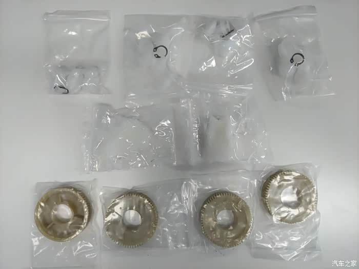 一次买了4只,每一个齿轮有配套的6个塑料固定卡和1个U型钢制固定卡,是安装时候必须要用的,老板送了两袋润滑油