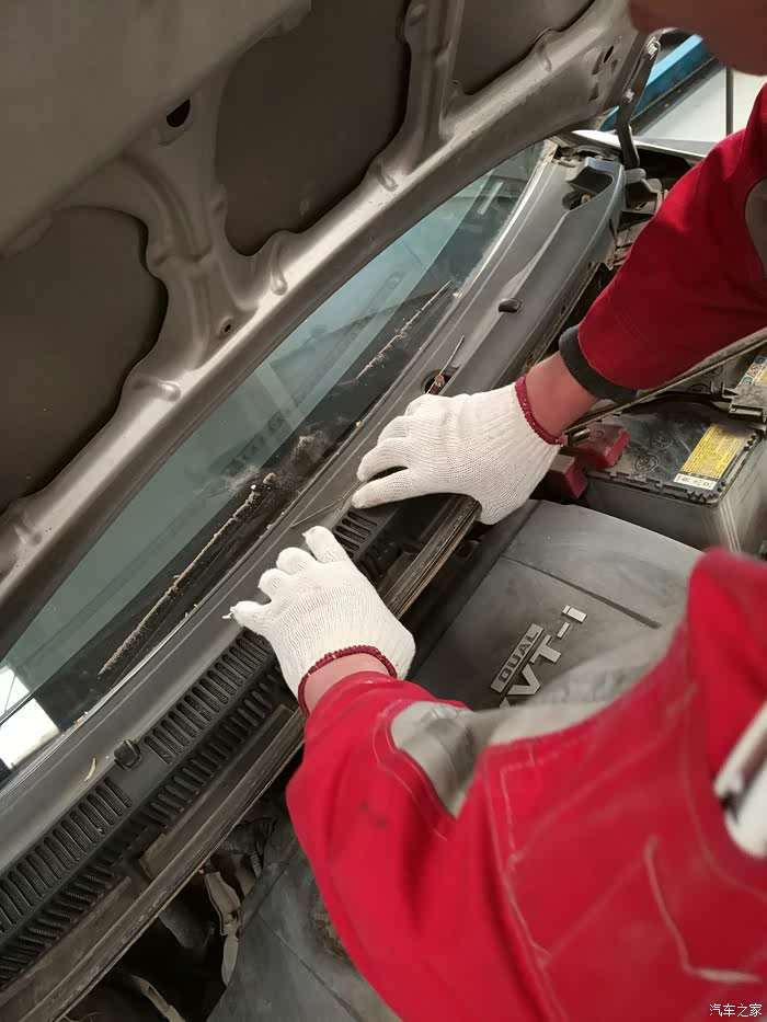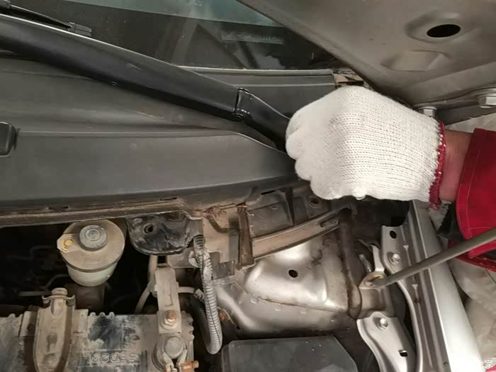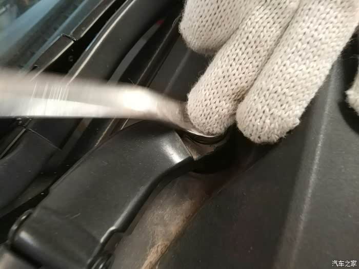 拆雨刷盖板之前需要把雨刷臂先拆掉,现在正在拆雨刷臂的固定螺丝。