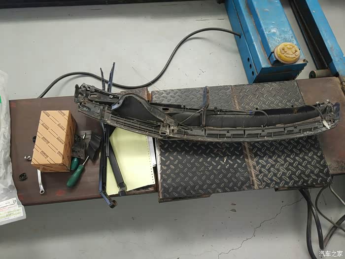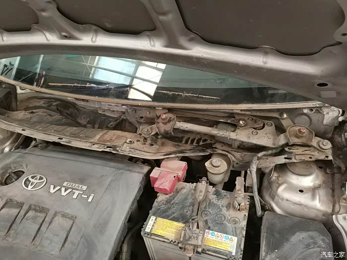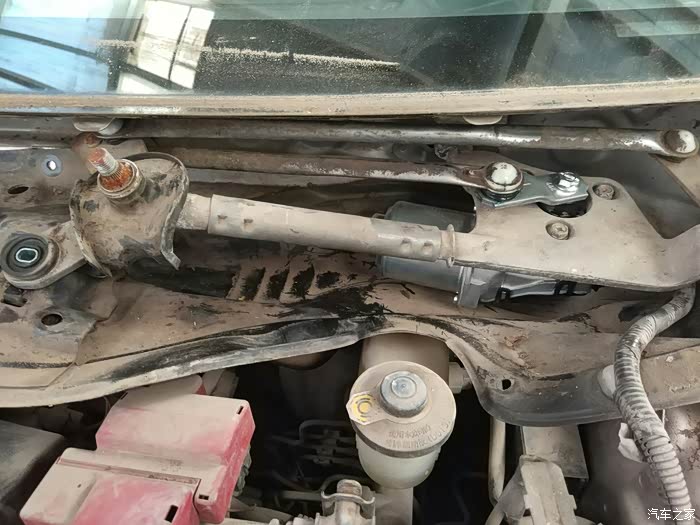 看见了么。雨刷电机,和雨刷连杆在盖板下面装着。都生锈了。