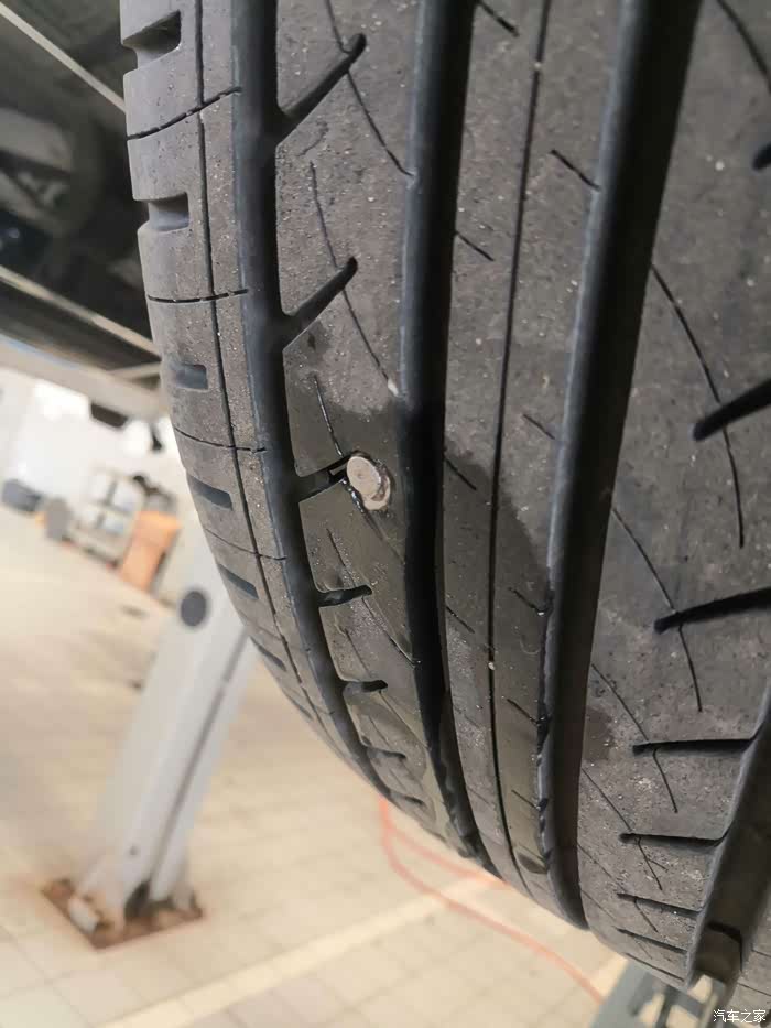 发现左后轮胎被扎一钉子,貌似很长时间了,因为没影响轮胎气压,又没及时检查,一直没发现